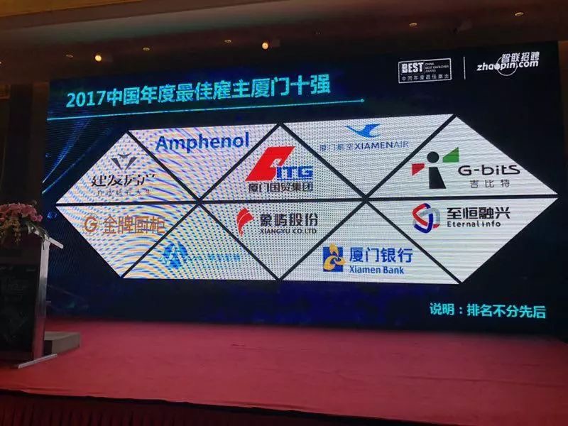 2017中國(guó)年度最佳雇主頒獎(jiǎng)盛典在廈門舉行。活動(dòng)當(dāng)天揭曉了2017年廈門年度最佳雇主10強(qiáng),廈門國(guó)貿(mào)以絕對(duì)優(yōu)勢(shì),再次入選廈門年度最佳雇主10強(qiáng)榜單。