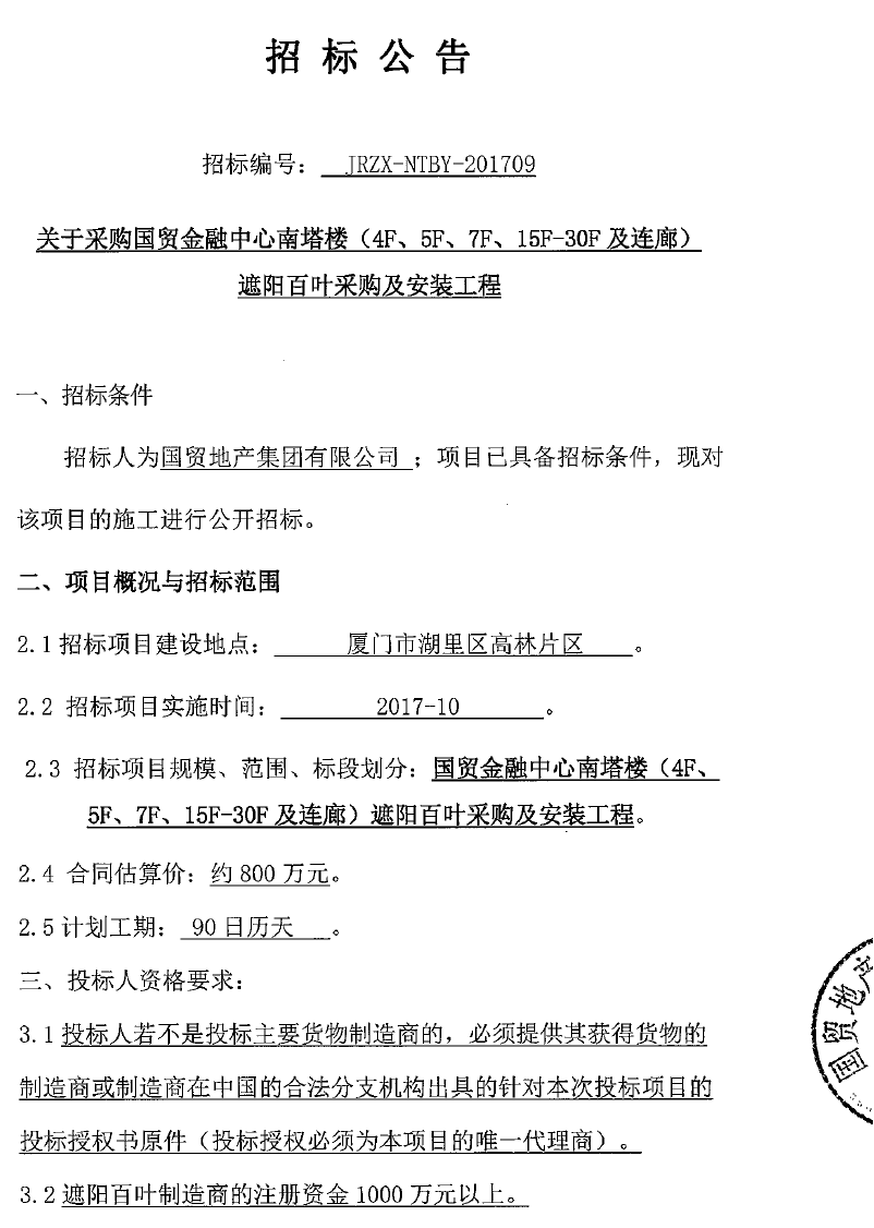 國(guó)貿(mào)金融中心南塔樓(4F、5F、7F、15F~30F及連廊)遮陽(yáng)百葉采購(gòu)及安裝工程