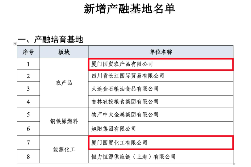 大連商品交易所發(fā)布公告,分別增設(shè)廈門國貿(mào)農(nóng)產(chǎn)品有限公司、廈門國貿(mào)化工有限公司為農(nóng)產(chǎn)品板塊、能源化工板塊的產(chǎn)融培育基地。